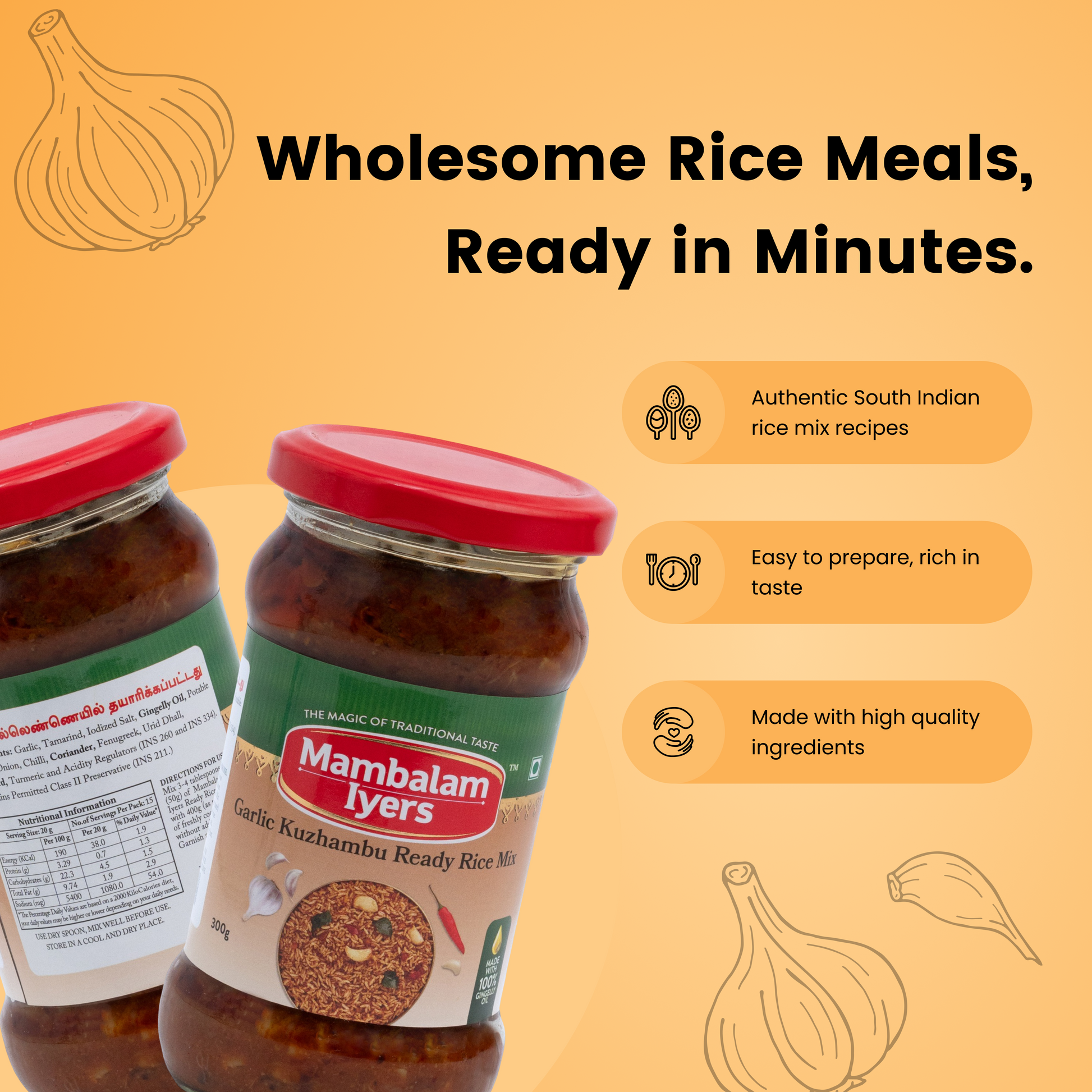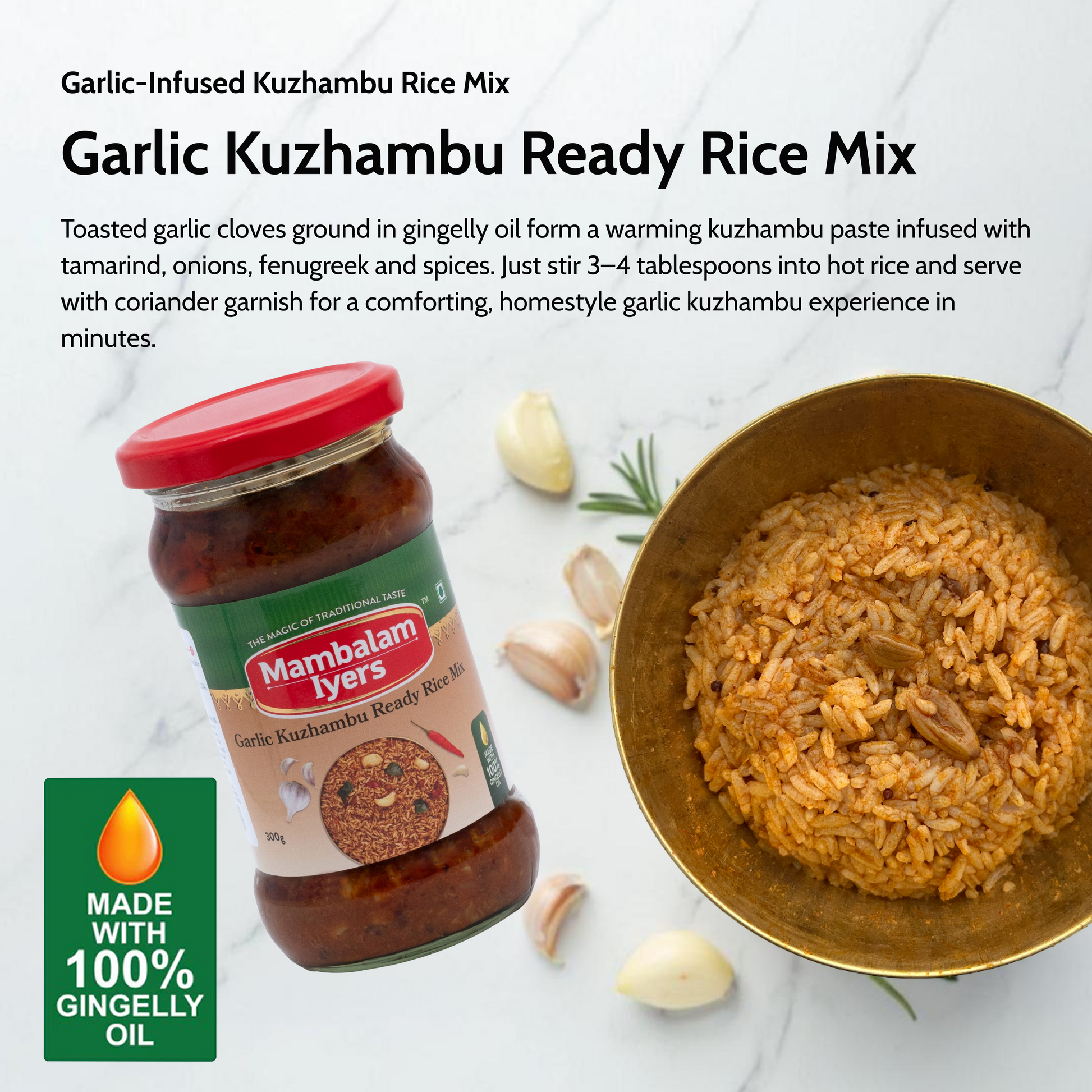 Simply mix 3-4 tablespoons of your favourite Mambalam Iyers Ready Rice Mix with 400g of hot, cooked rice. Do not add salt. Stir well and serve hot!