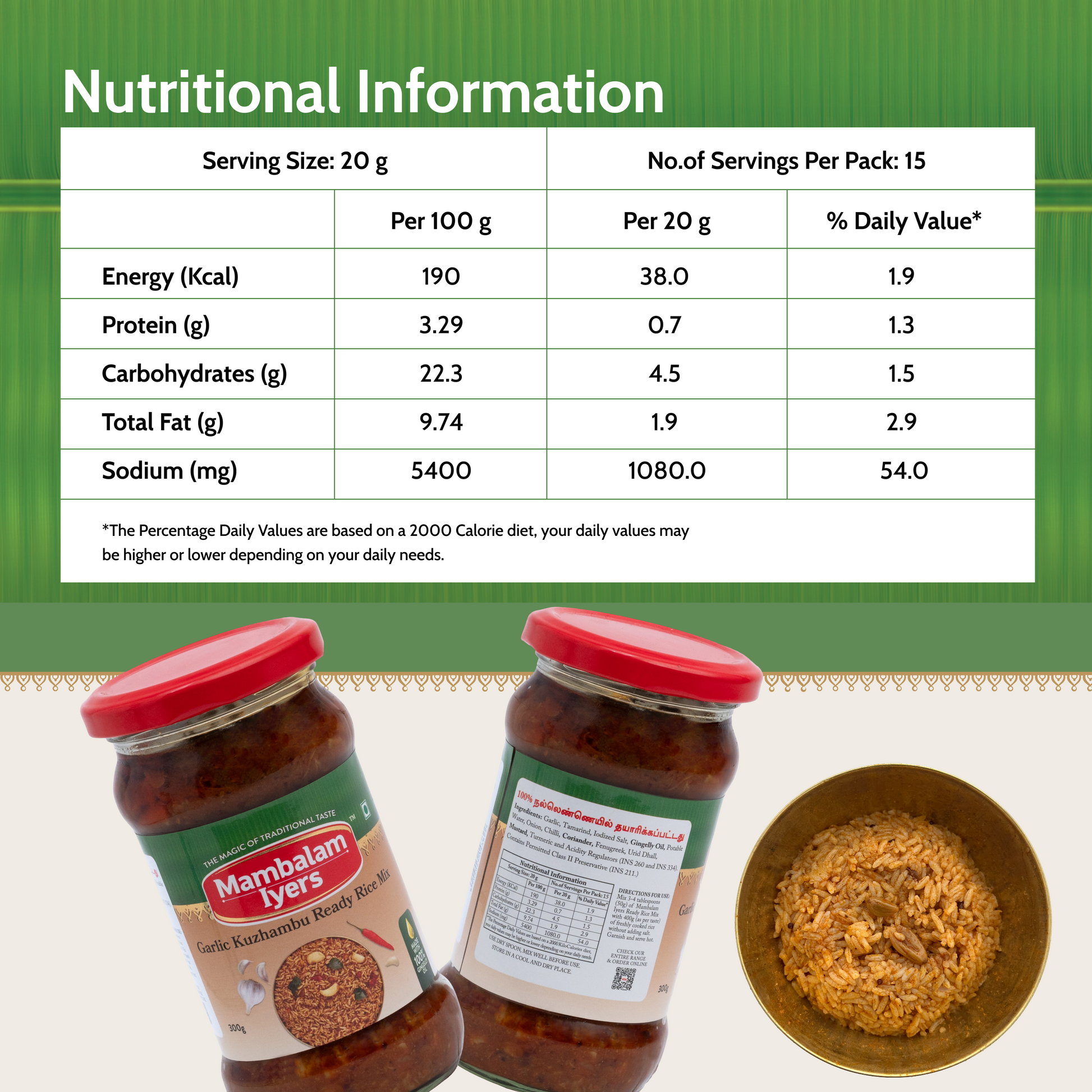 Garlic cloves and paste, Tamarind paste, Salt, Gingelly oil, Water, Onion paste, Chilli powder, Urad dal, Coriander powder, Fenugreek powder, Mustard, Turmeric powder, permitted Class II preservatives (E 211)
