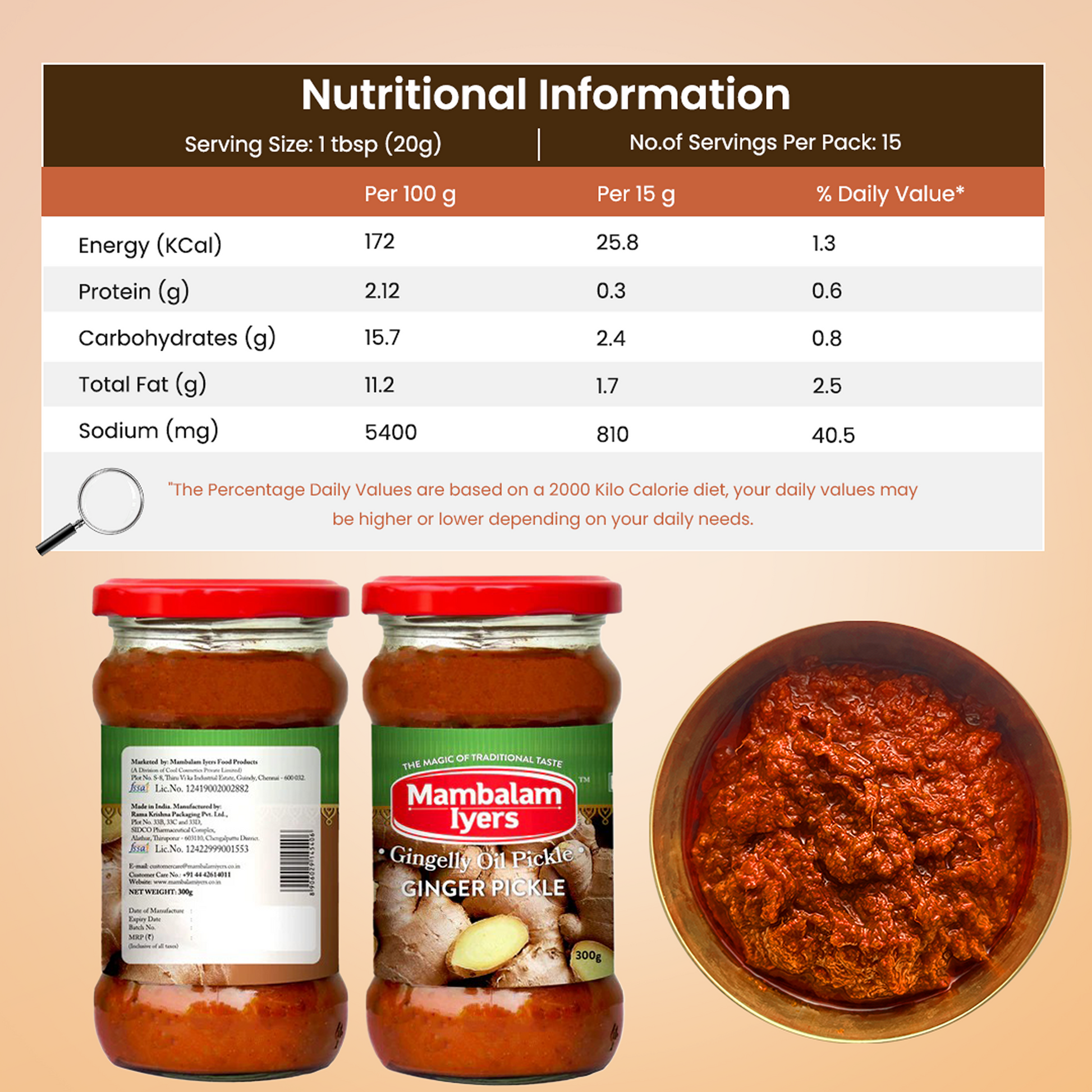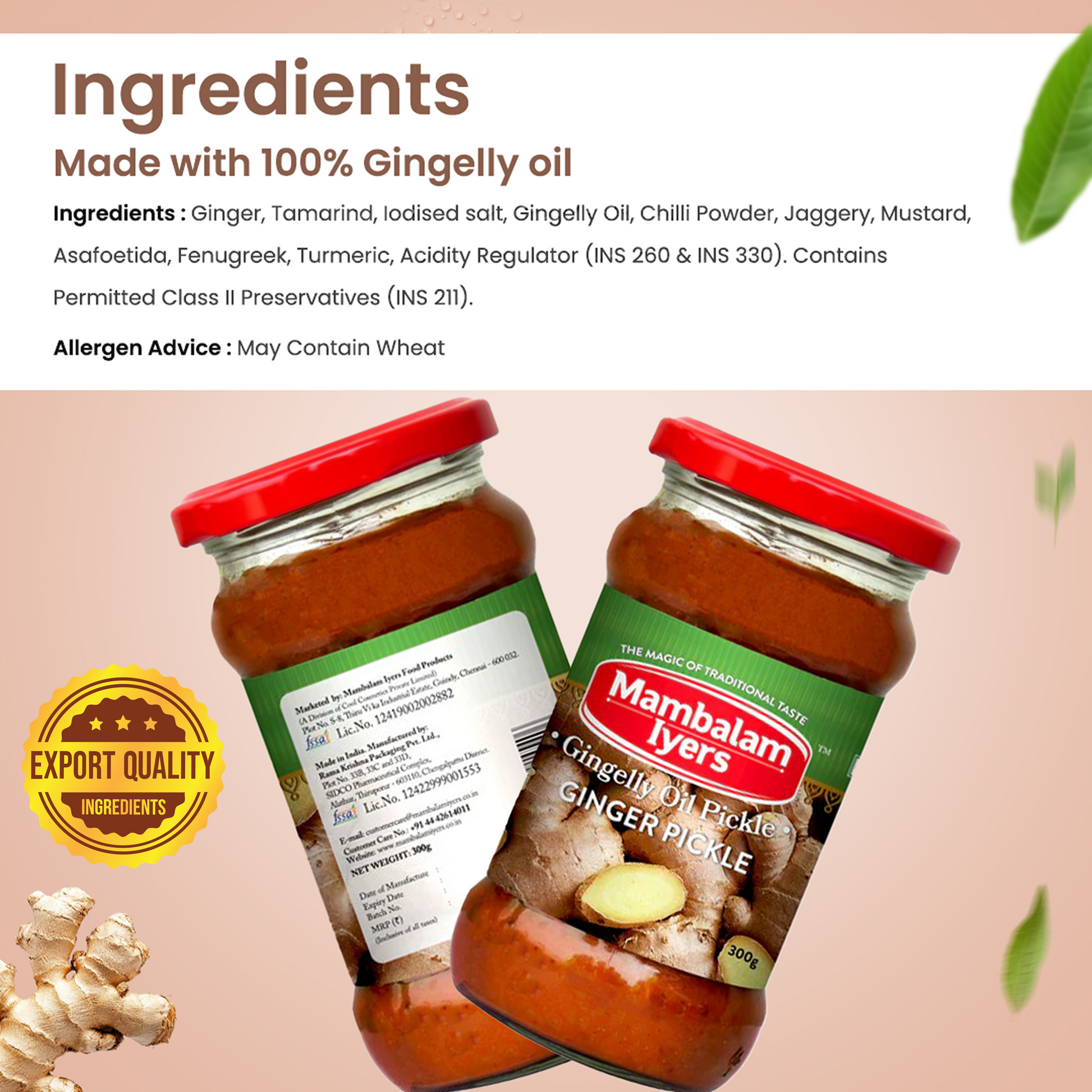 Ginger, Tamarind, Iodised salt, Gingelly Oil, Chilli Powder, Jaggery, Mustard, Asafoetida, Fenugreek, Turmeric, Acidity Regulator (INS 260 & INS 330). Contains Permitted Class II Preservatives (INS 211).