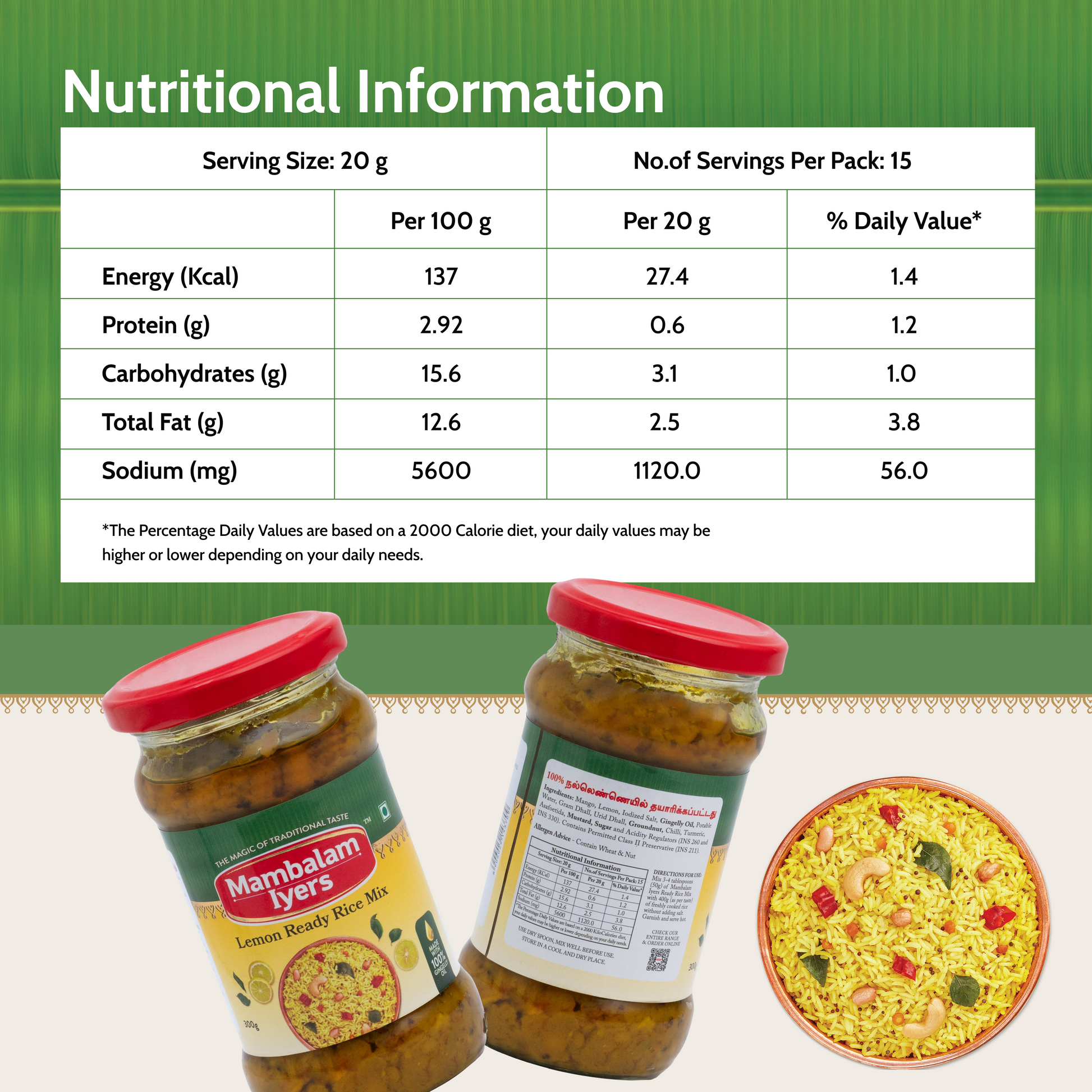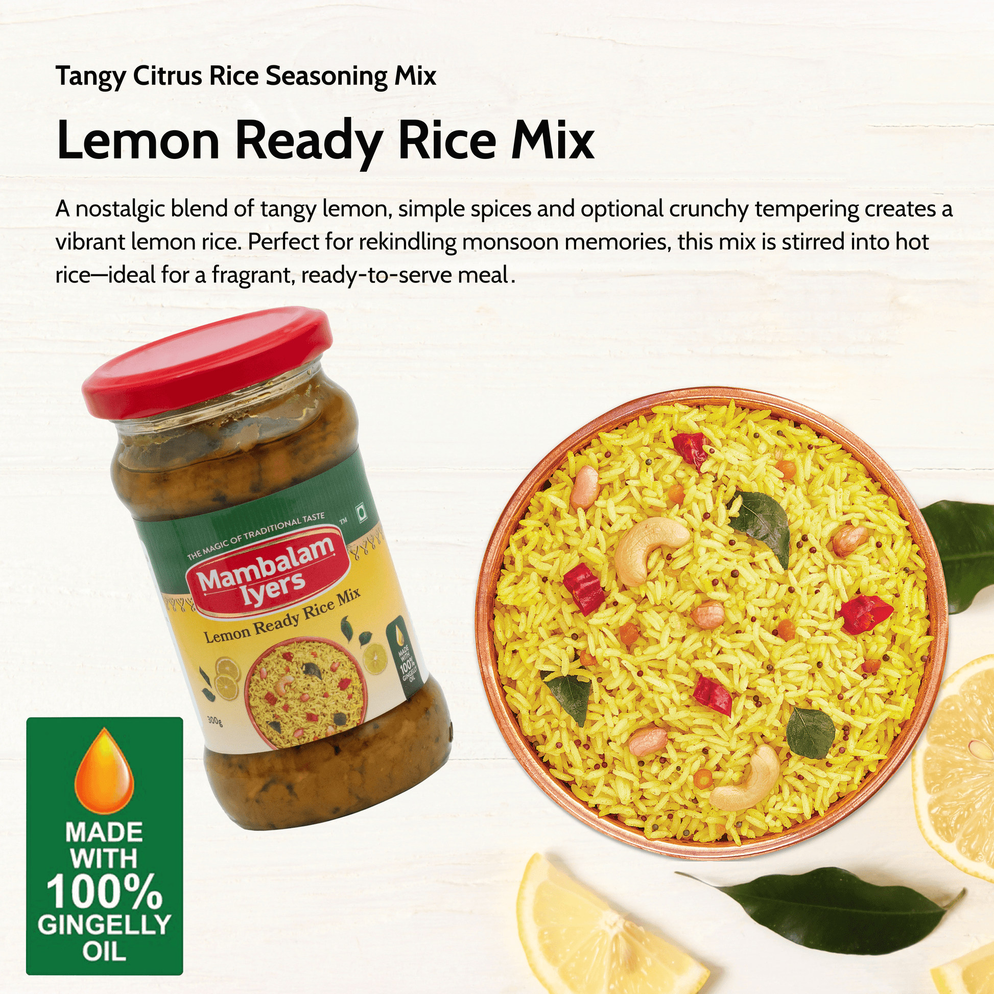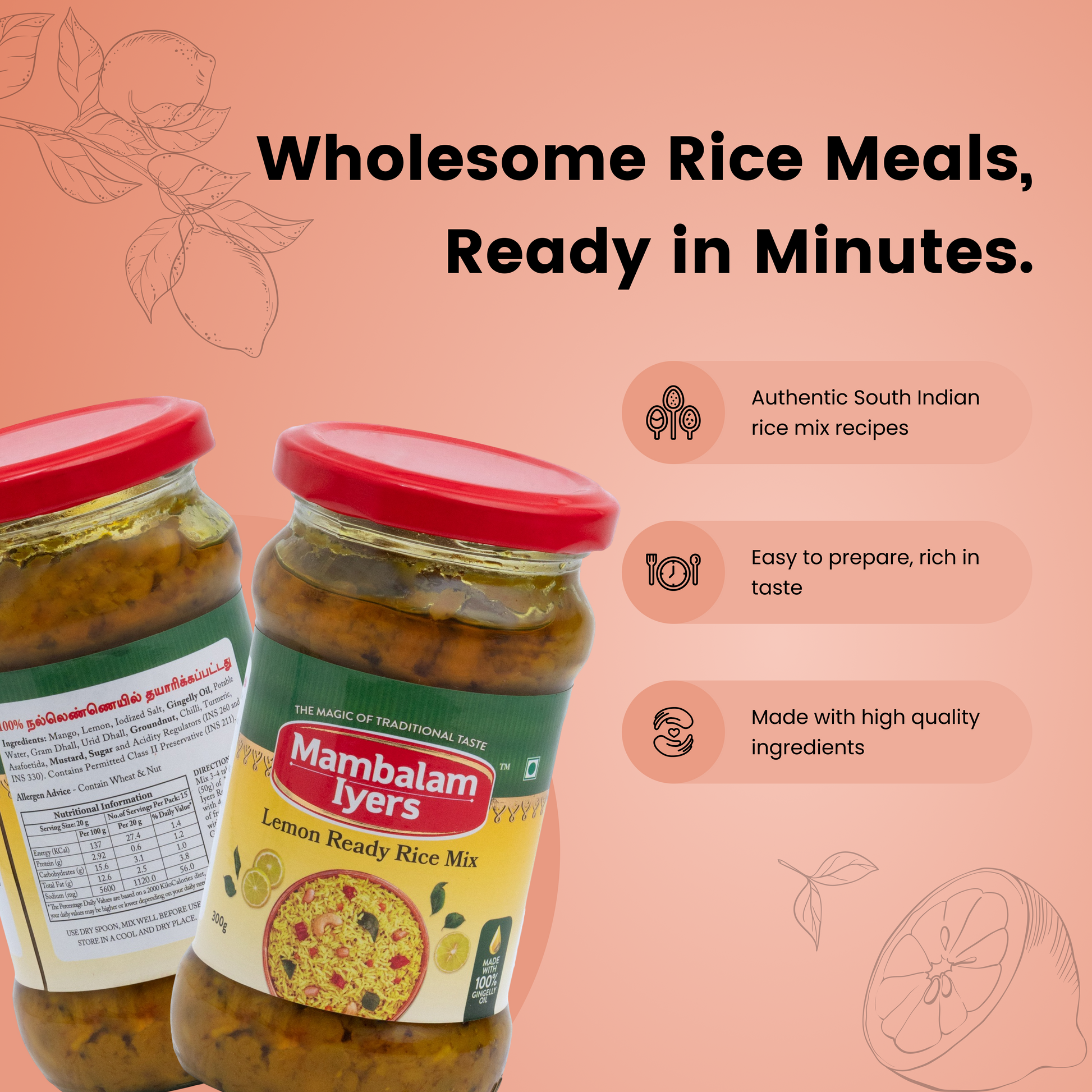 Simply mix 3-4 tablespoons of your favourite Mambalam Iyers Ready Rice Mix with 400g of hot, cooked rice. Do not add salt. Stir well and serve hot!