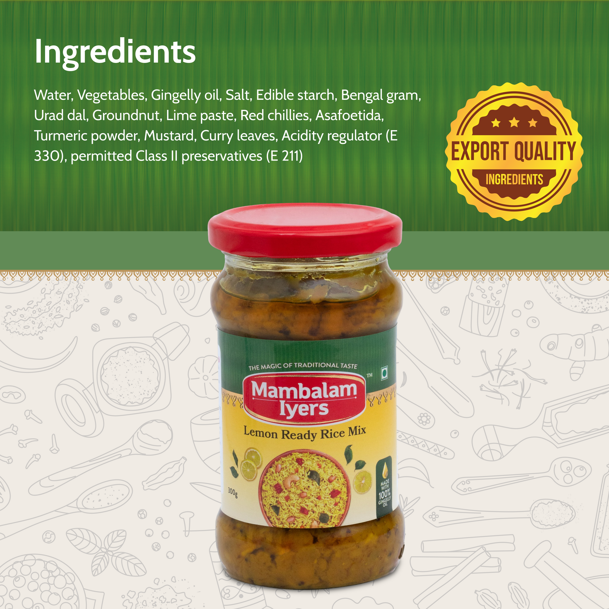 Water, Vegetables, Gingelly oil, Salt, Edible starch, Bengal gram, Urad dal, Groundnut, Lime paste, Red chillies, Asafoetida, Turmeric powder, Mustard, Curry leaves, Acidity regulator (E 330), permitted Class II preservatives (E 211)