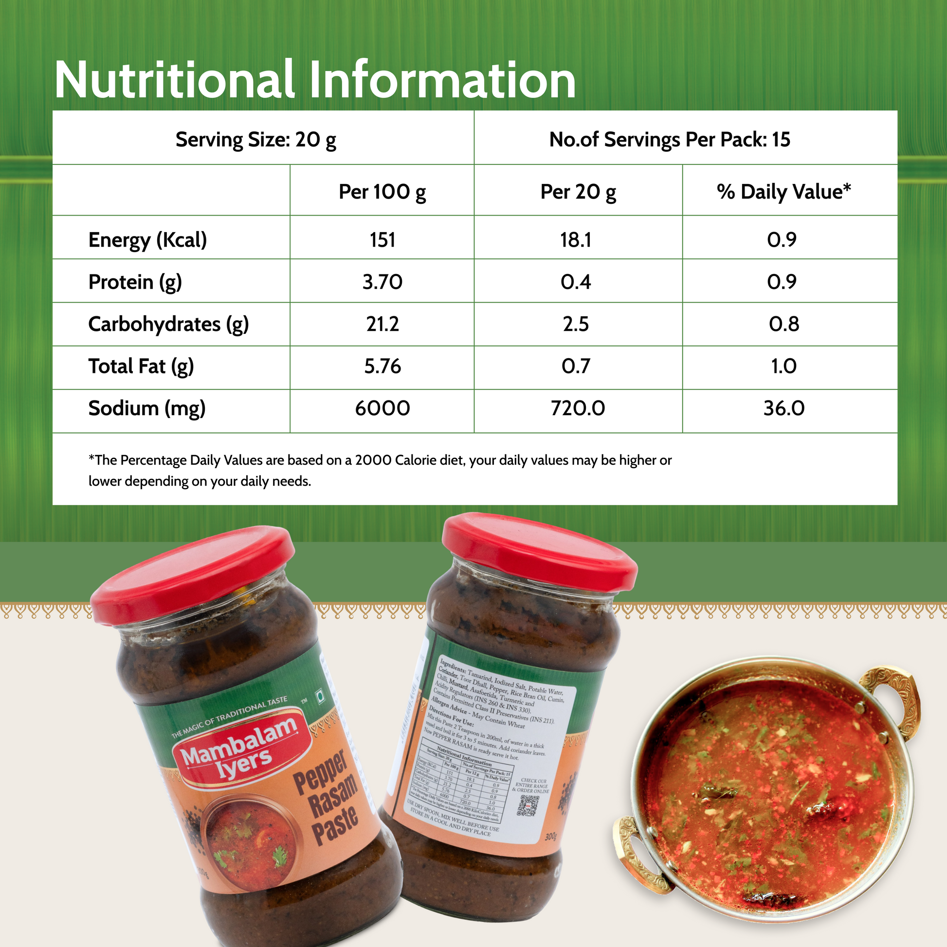 Mambalam Iyers Pepper Rasam Paste is a blend of traditional South Indian spices and Dhal, specifically designed to create a warming and comforting pepper rasam. It's perfect for cold days or as a soothing remedy.