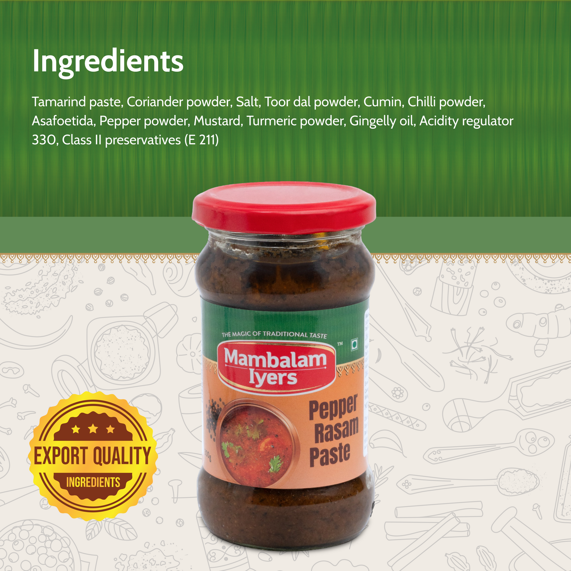 The paste contains a blend of traditional South Indian spices and herbs, such as Tamarind, Iodized Salt, Potable Water, Coriander, Toor Dhall, Pepper, Rice Bran Oil, Cumin, Chilli, Mustard, Asafoetida, Turmeric and Acidity Regulators (INS 260 & INS 330). Contains Permitted Class II Preservatives (INS 211).
