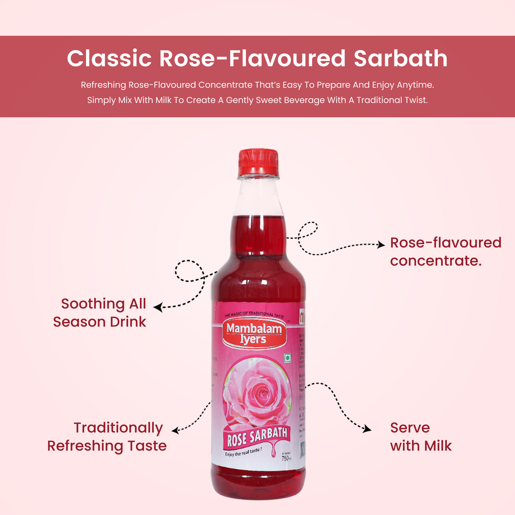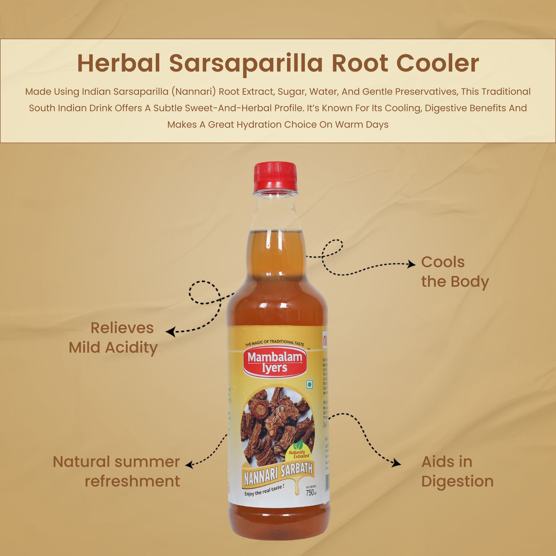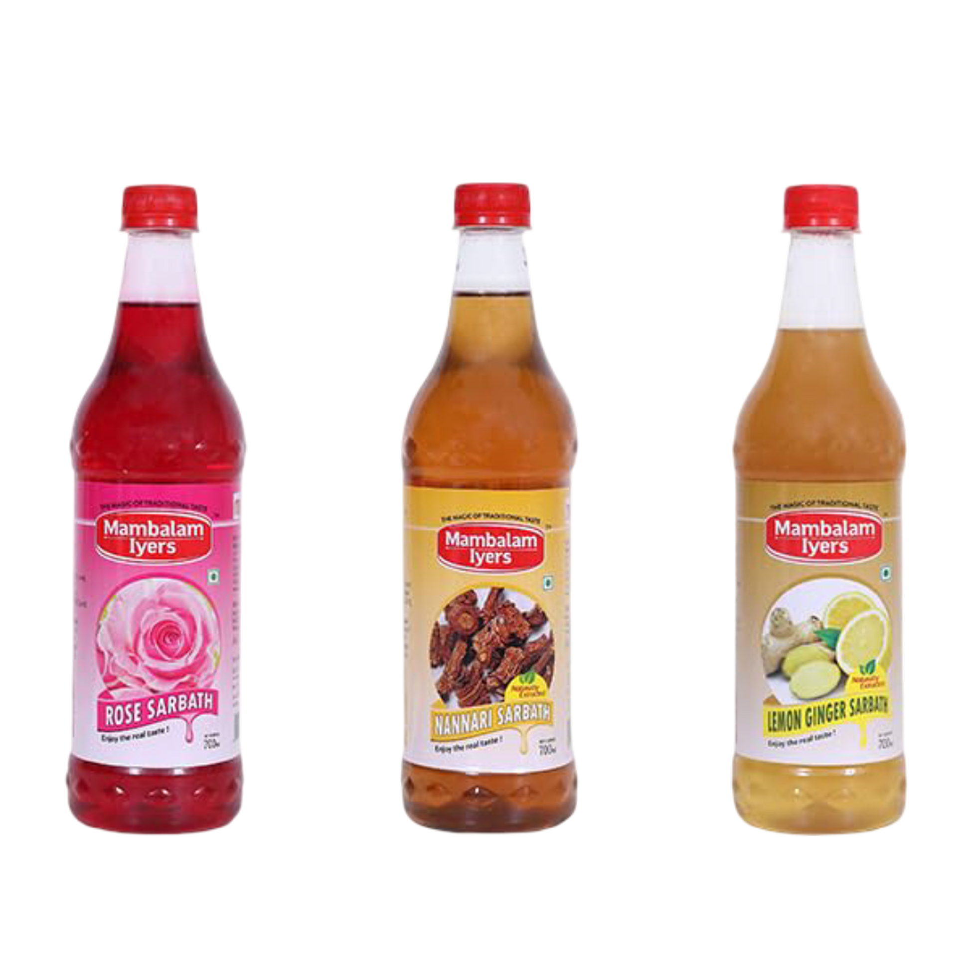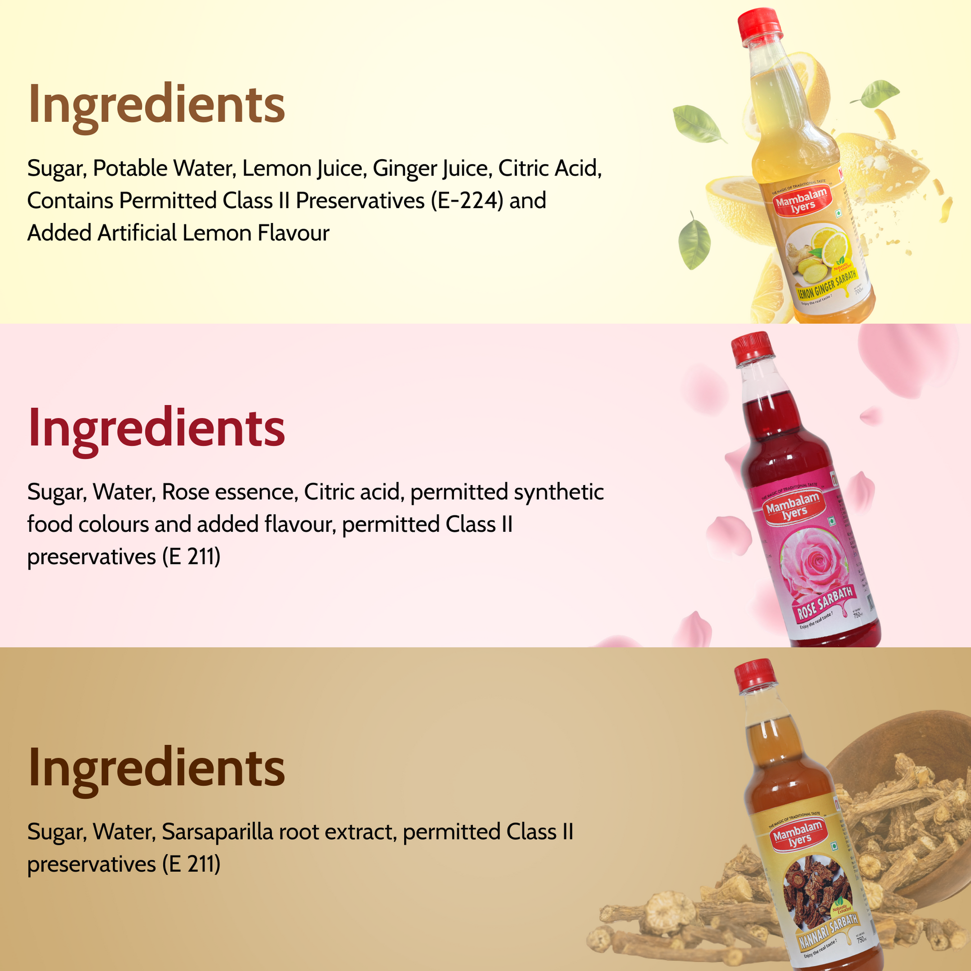 Lemon sarbath-Sugar, Water, Lemon juice, Ginger juice, Citric acid, Artificial lemon flavour, permitted Class II preservatives (E 211). Nannari sarbath-Sugar, Water, Sarsaparilla root extract, permitted Class II preservatives (E 211). Rose sarbath-Sugar, Water, Rose essence, Citric acid, permitted synthetic food colours and added flavour, permitted Class II preservatives (E 211)
